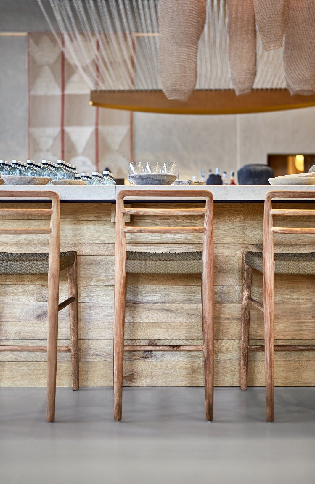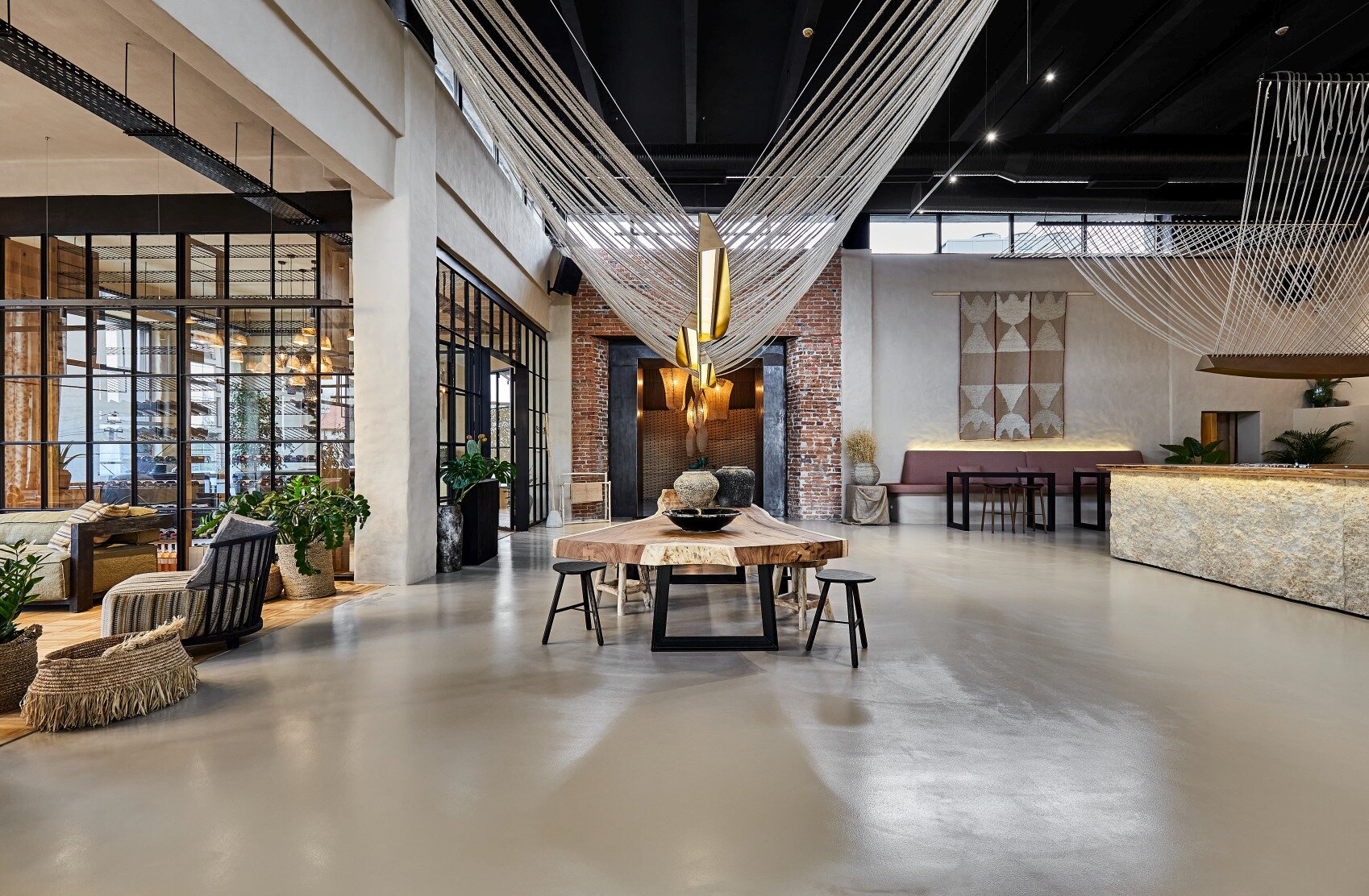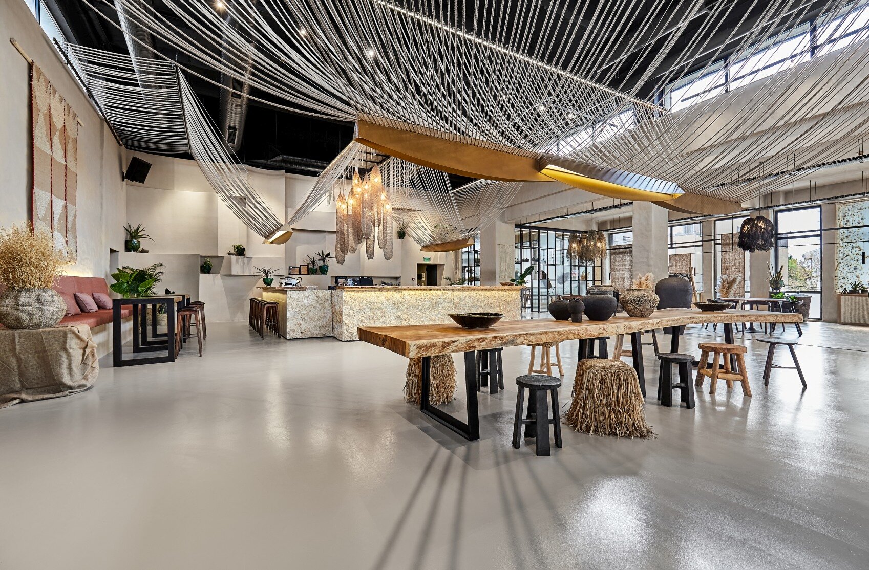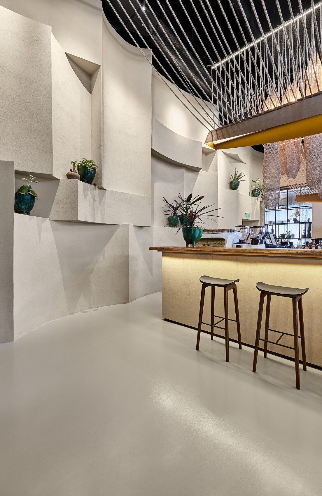 Spatial coherence is achieved by harmonizing architectural elements in a scenographic sequence: the fluid staircase, the volumetric wall, and the raw mass of the bar. Rope, an element of connection, becomes part of the meaningful fabric of the place. The “furnishing” of the ceiling with rope, evoking the skeleton of a ship, emphasizes the height, links natural and artificial light, and creates various tones of light and shadow, imitating natural conditions and giving structure to the interior.