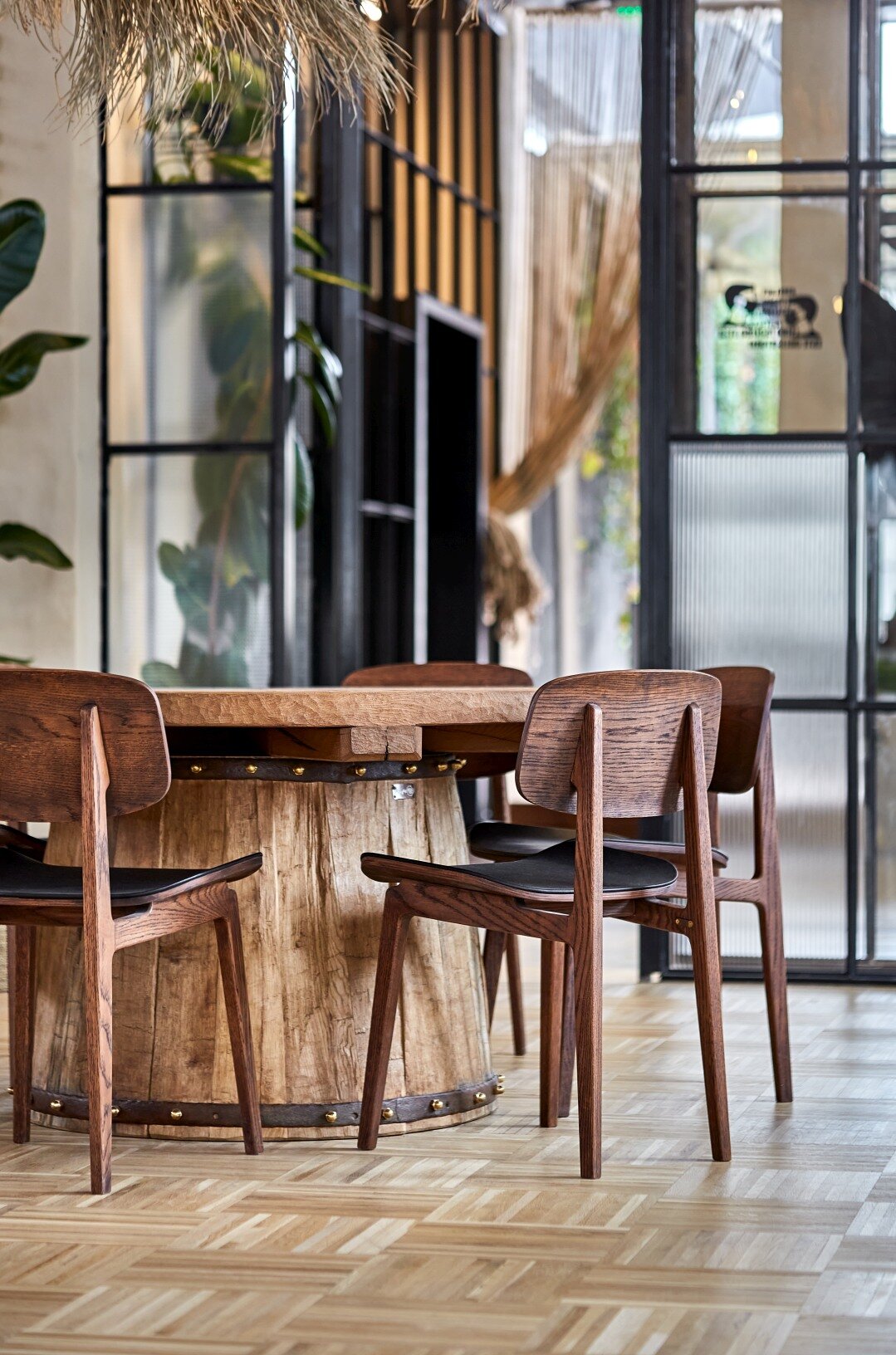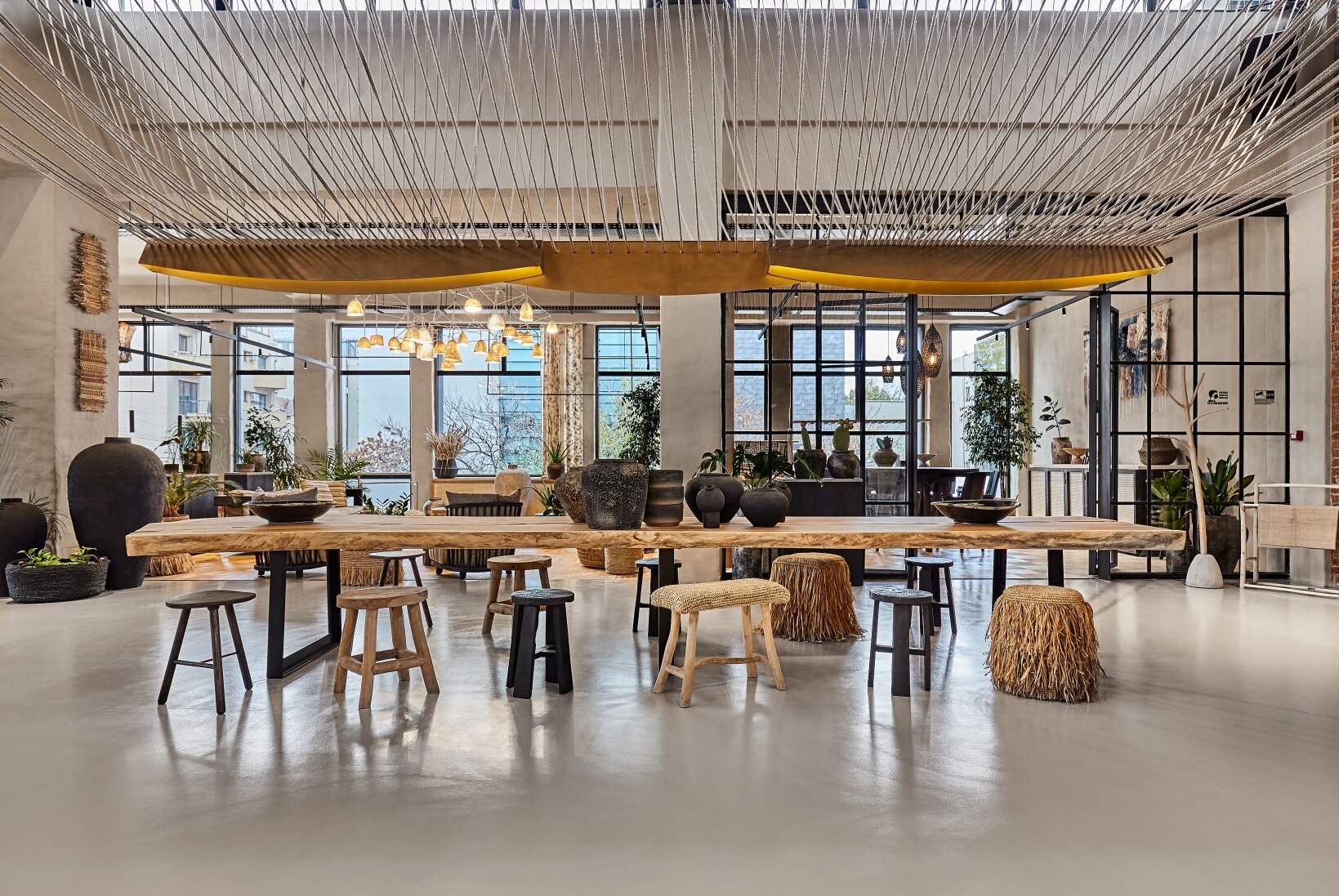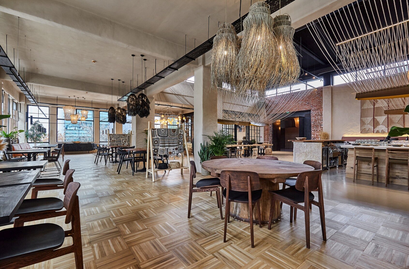 Spatial coherence is achieved by harmonizing architectural elements in a scenographic sequence: the fluid staircase, the volumetric wall, and the raw mass of the bar. Rope, an element of connection, becomes part of the meaningful fabric of the place. The “furnishing” of the ceiling with rope, evoking the skeleton of a ship, emphasizes the height, links natural and artificial light, and creates various tones of light and shadow, imitating natural conditions and giving structure to the interior.