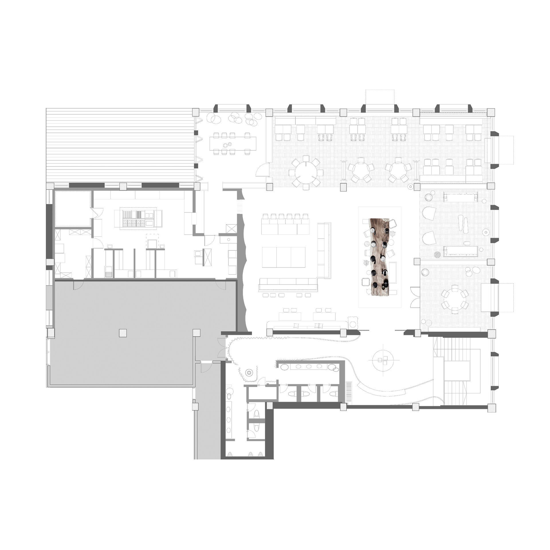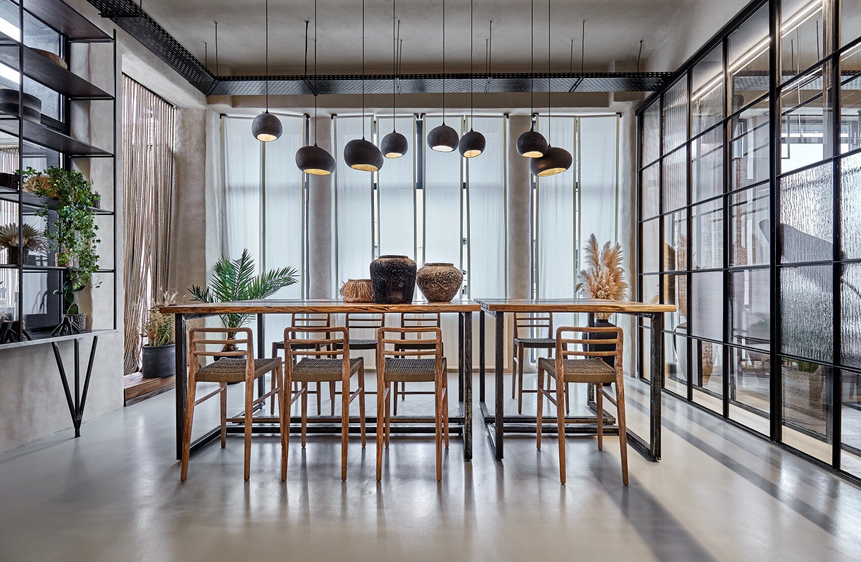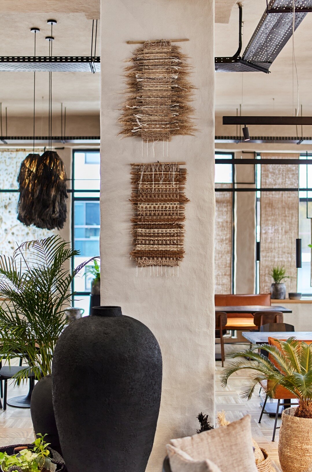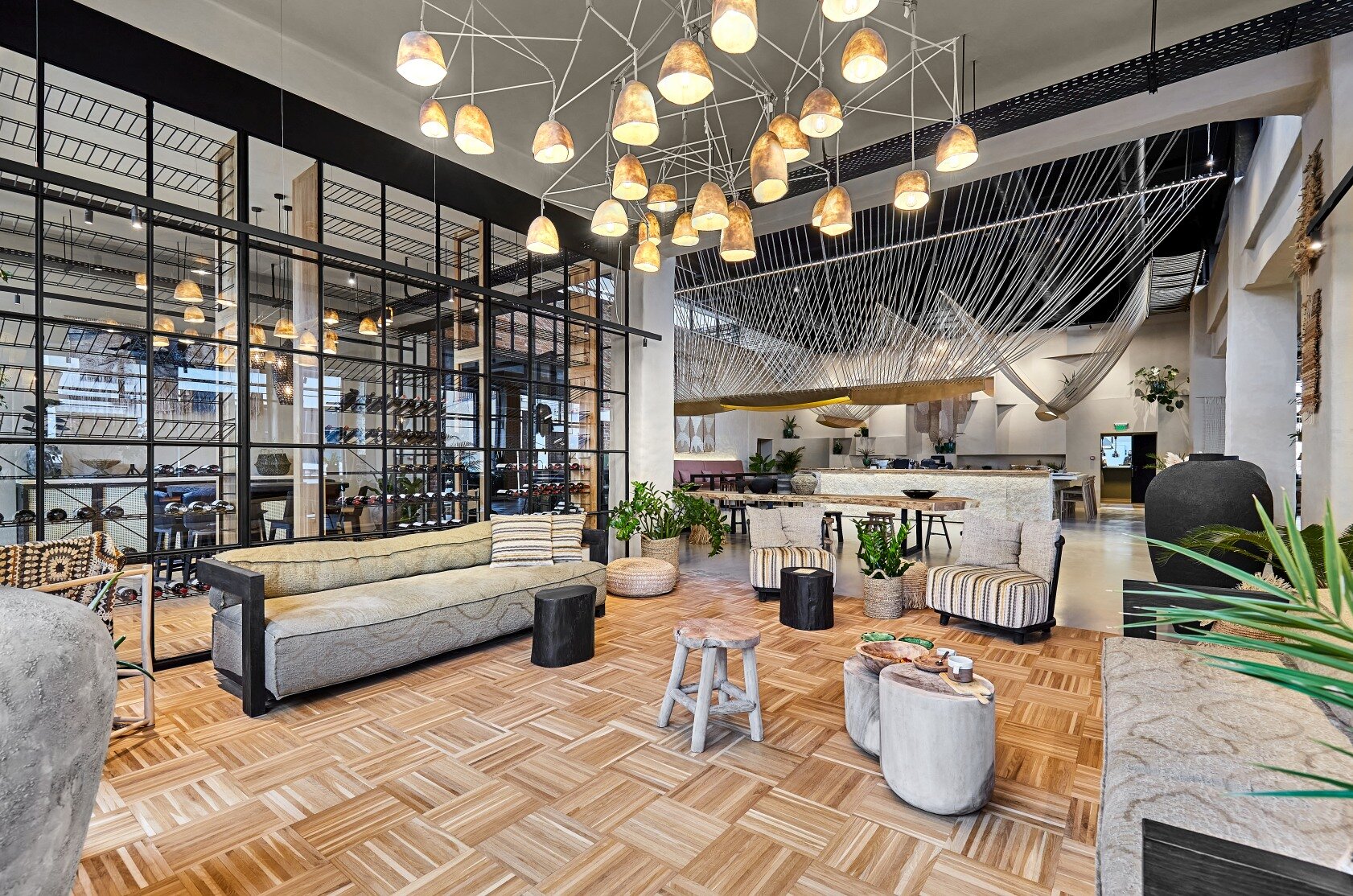 Spatial coherence is achieved by harmonizing architectural elements in a scenographic sequence: the fluid staircase, the volumetric wall, and the raw mass of the bar. Rope, an element of connection, becomes part of the meaningful fabric of the place. The “furnishing” of the ceiling with rope, evoking the skeleton of a ship, emphasizes the height, links natural and artificial light, and creates various tones of light and shadow, imitating natural conditions and giving structure to the interior.
