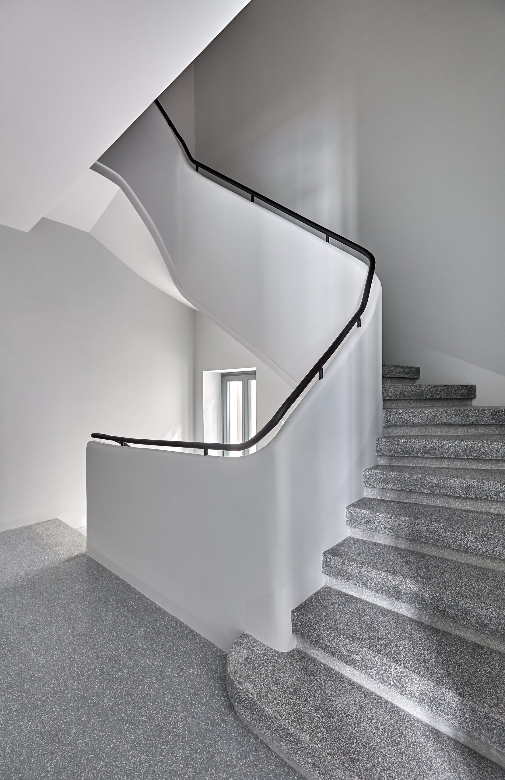 The new proposal preserves the building envelope intact, while the internal layout is partially retained and adapted to new requirements. The ground and first floors accommodate offices, while the attic hosts two apartments—a studio and a three-room apartment. Service spaces, including storage, laundry, and the boiler room, are located in the basement.